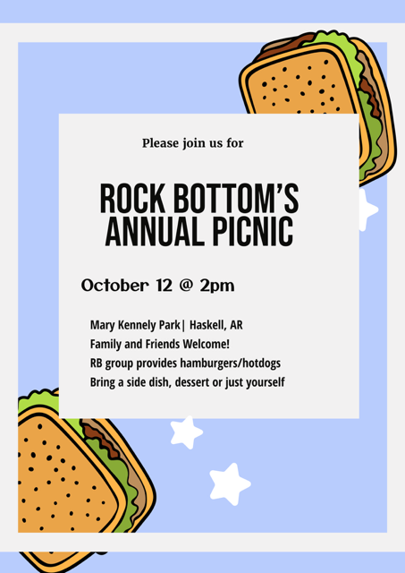Rock Bottom’s Annual Picnic Date & Time: October 12 @ 2:00 PM Location: Mary Kennely Park, Haskell, AR — Open in Google Maps Family and Friends Welcome!RB group provides hamburgers and hot dogs. Bring a side dish, dessert, or just yourself.