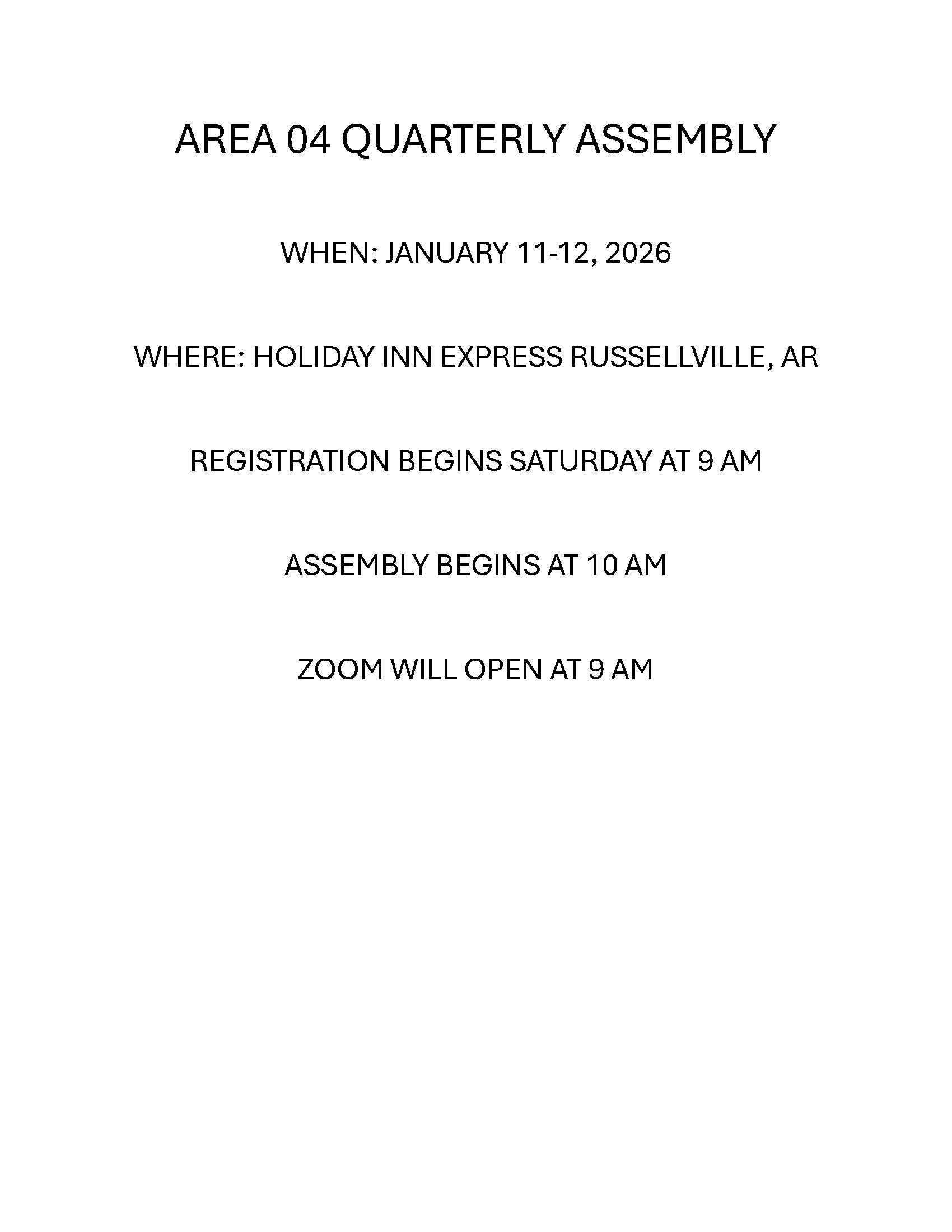 300 East Harrell Drive 300 East Harrell Drive, Russellville, AR, United StatesArea 4 Quarterly Assembly/Business Meeting. Registration begins at 9:00 AM on Saturday, January 10th, 2026. Assembly starts at 10 AM and will continue until approximately Noon on 1-11-2026.